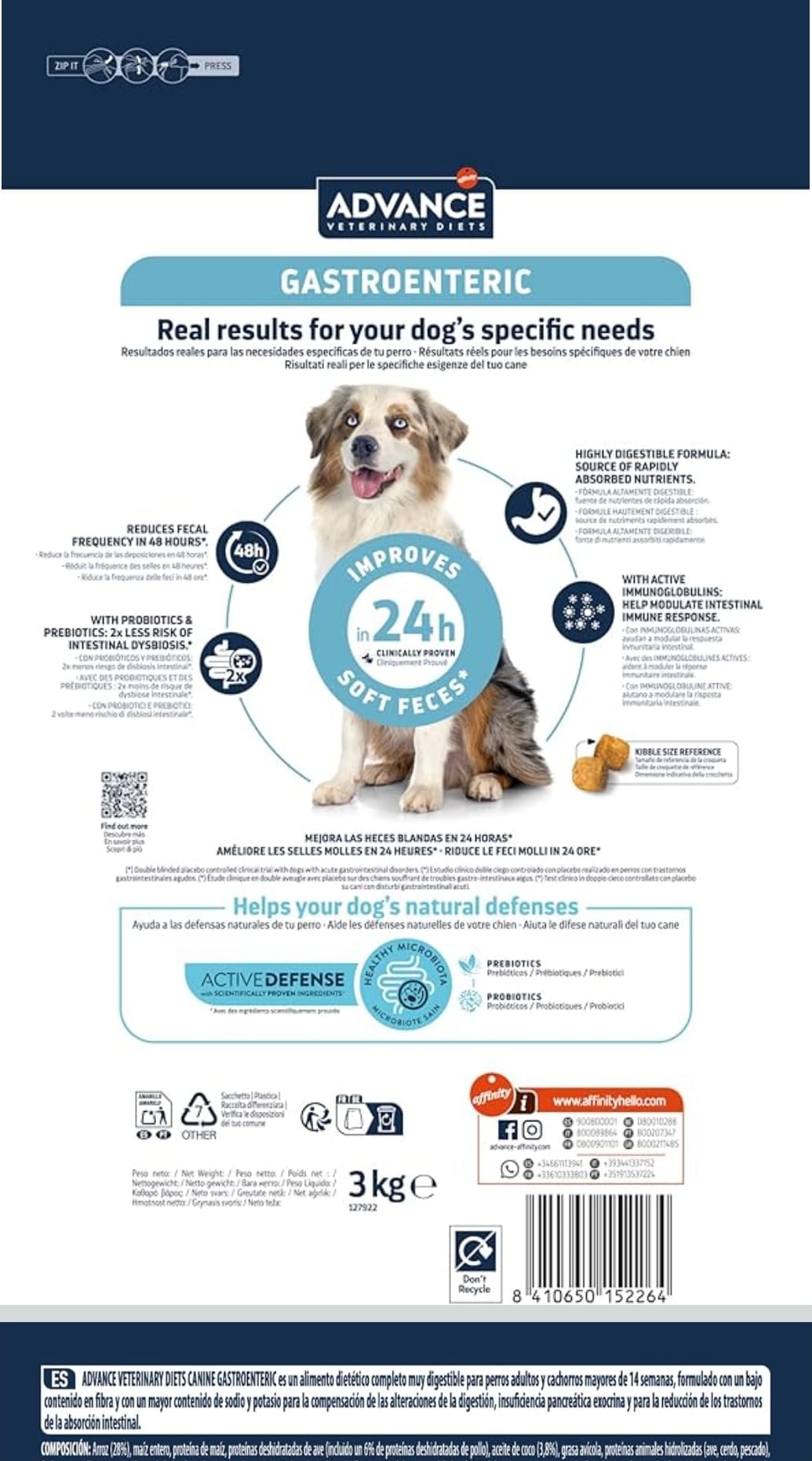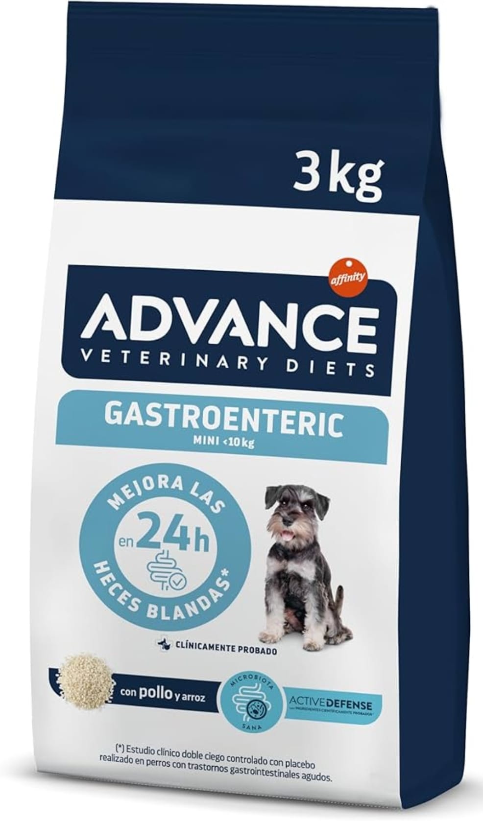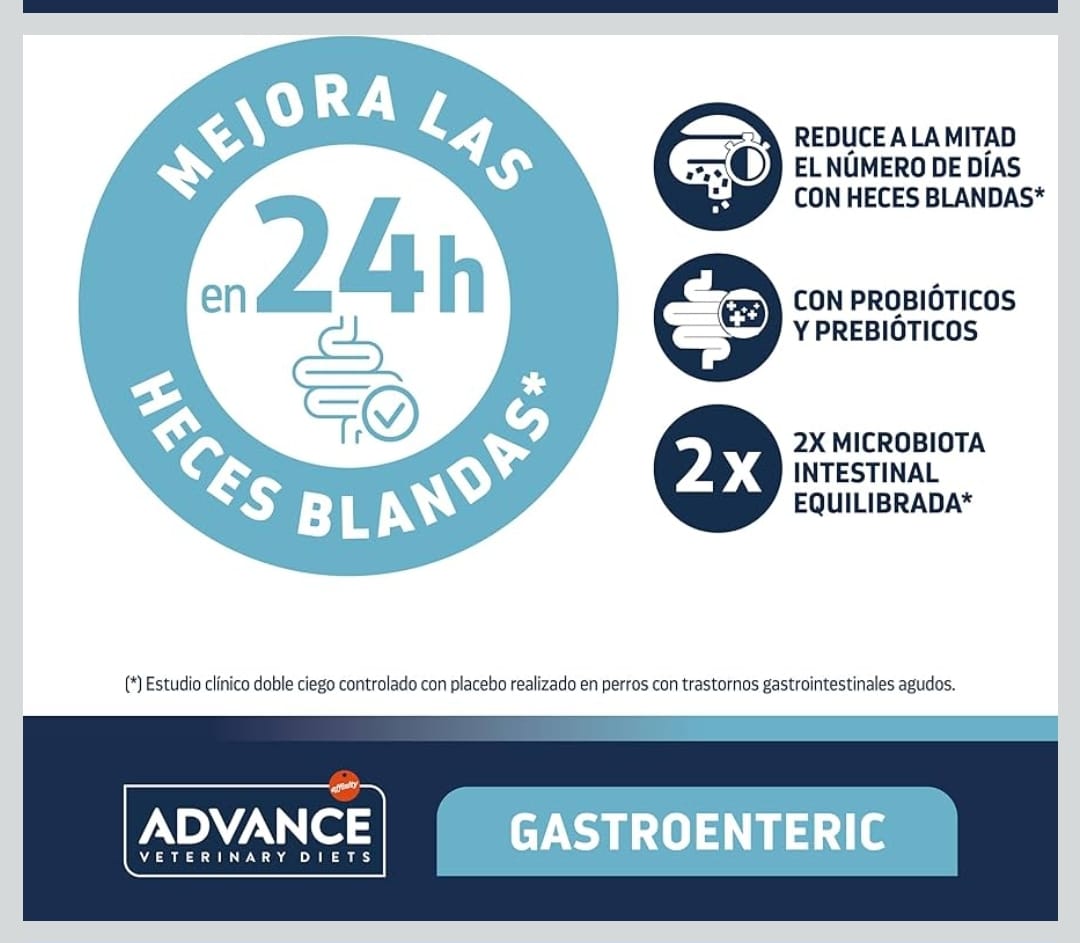 ADVANCE VETERINARY DIETS Gastroenteric Mini cuenta con resultados clínicamente probados: ayuda a mejorar las heces blandas en solo 24 horas y a reducir la frecuencia de las deposiciones en 48 horas. Además, disminuye a la mitad el riesgo de sufrir disbiosis.*