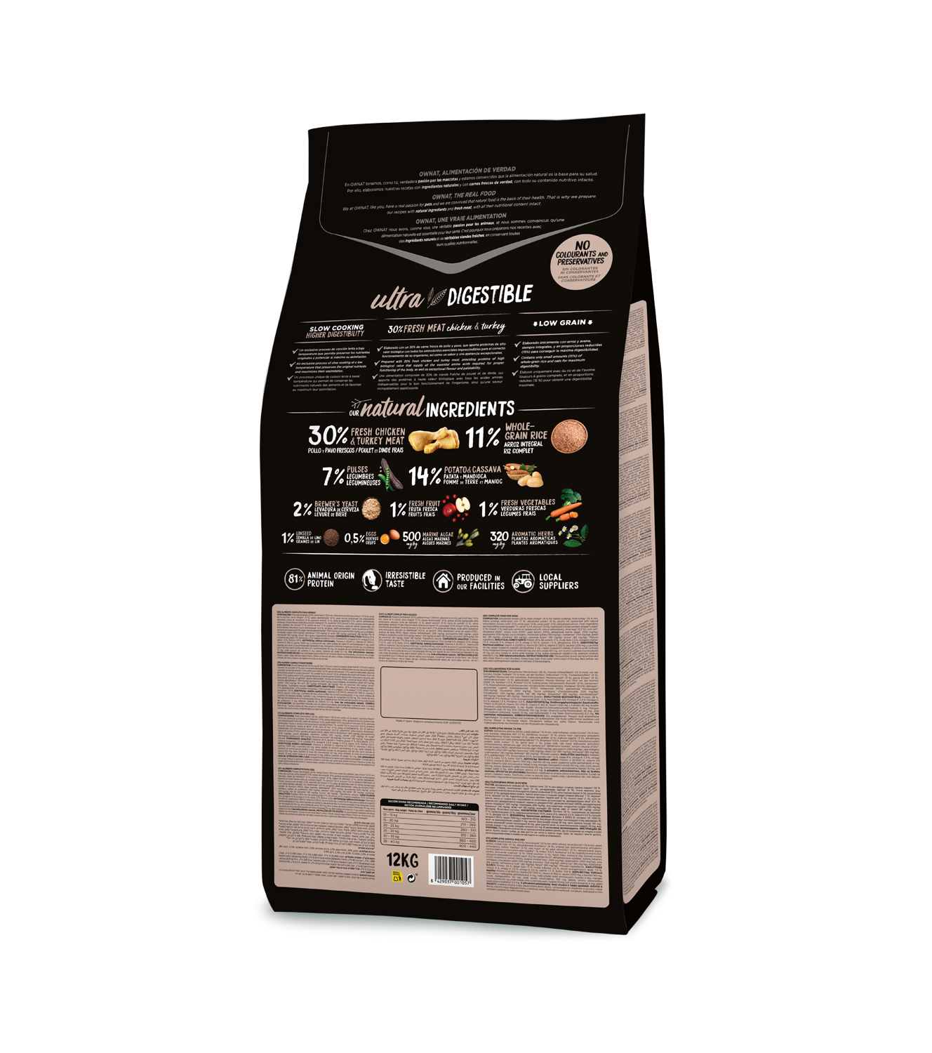 Pollo deshidratado (20 %), pollo fresco* (15 % mín. antes de la cocción), pavo fresco* (15 % mín. antes de la cocción), arroz integral* (11 %), patata deshidratada* (9 %), grasa avícola (preservada con antioxidantes naturales), raíces de mandioca* (5 %), guisantes enteros* (4 %), vaina de algarroba* (3 %), salmón deshidratado, verduras y frutas frescas antes de la cocción (manzana* 1 %, zanahoria* 0,5 %, brócoli* 0,5 %), proteína hidrolizada de pollo, levadura de cerveza* (2 %), semilla de lino* (1 %), pulpa de remolacha, aceite de salmón (preservado con antioxidantes naturales), huevo deshidratado* (0,5 %), sal gema*, alfalfa deshidratada*, raíces de achicoria (FOS)*, extracto de levadura (MOS), algas marinas deshidratadas* (500 mg/kg), glucosamina (500 mg/kg), yucca shidigera, condroitín sulfato (100 mg/kg), arándanos* (100 mg/kg), té verde* (80 mg/kg), equinácea* (80 mg/kg), flor de manzanilla* (80 mg/kg), hinojo* (80 mg/kg). *Ingredientes naturales